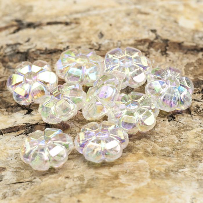 Vacker akrylpärla i form av en blomma. Pärlan är utan färg men har en vacker AB behandling som ger en skimrande lyster.
