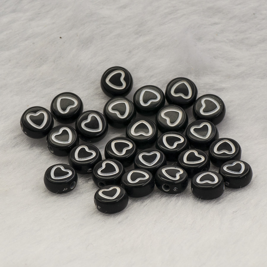Kul pärla med ett hjärta i akryl svart med vitt hjärta på. Passar utmärkt till våra populära bokstavspärlor då de är lika stora.