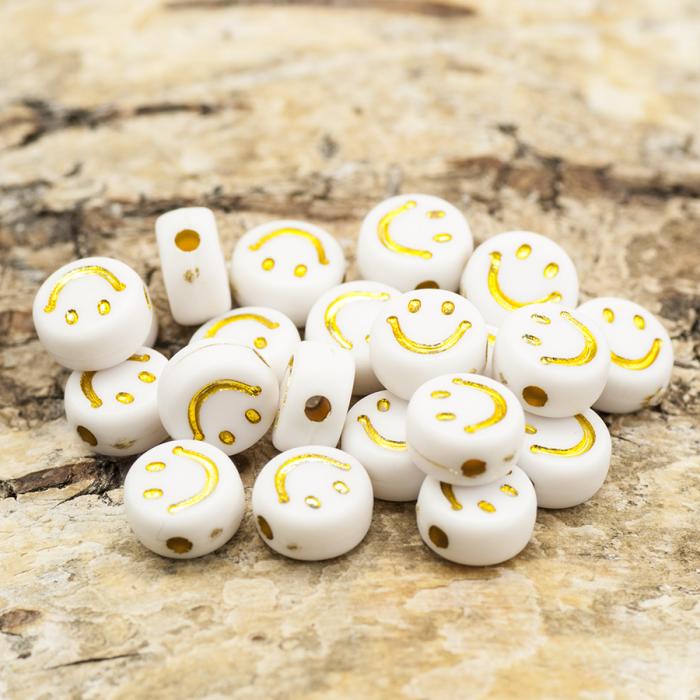 Vackra akrylpärlor i en vit färg med en jätteglad smiley i guld i mitten.