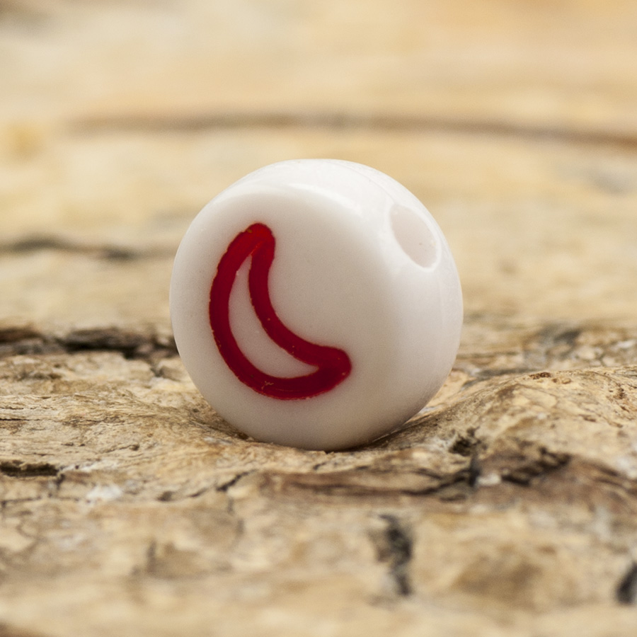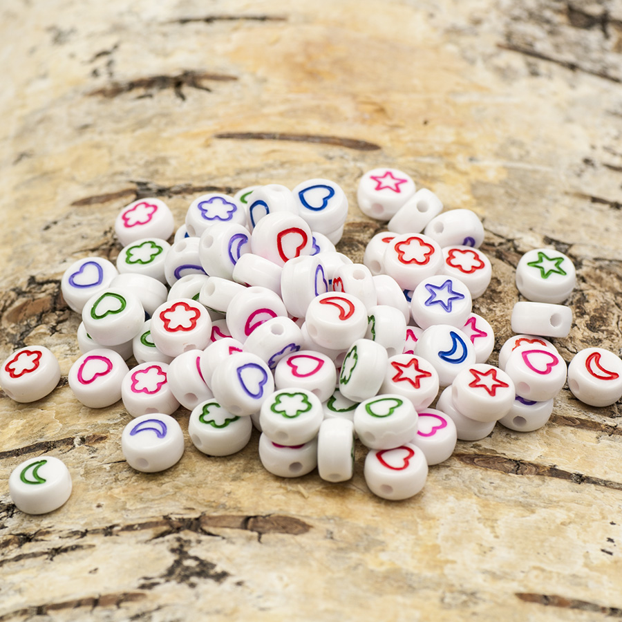 Vackra akrylpärlor i klar färg med en svart symbol mitt på. Symbolen kan vara en måne, ett hjärta, en stjärna och en blomma.