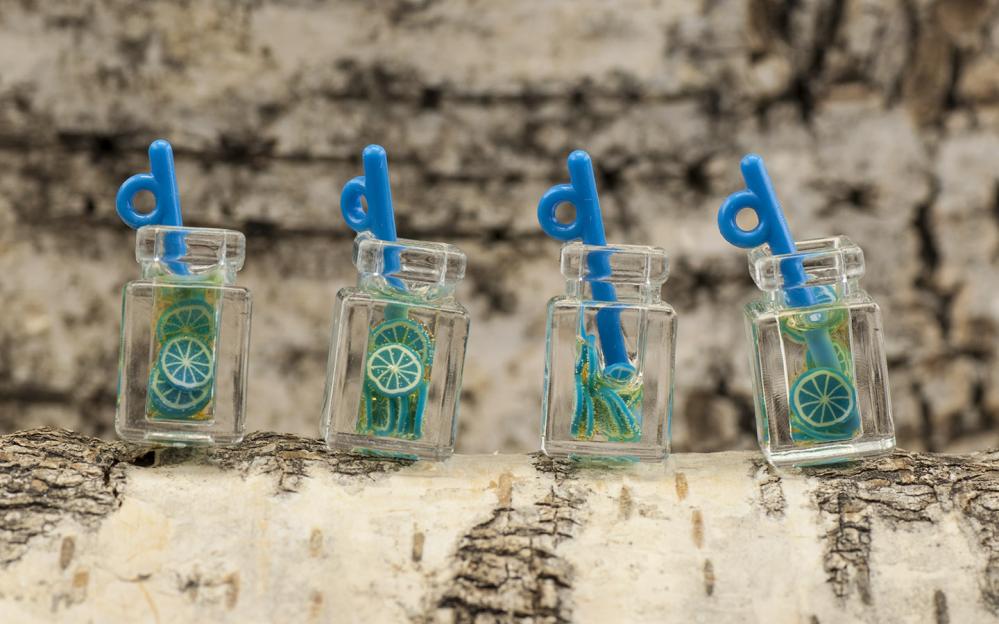 Läskande, speciell berlock att pynta ditt smycke med. Ett litet glas, fyllt med en härlig juice gjord på blå citrus, serveras med ett sugrör.