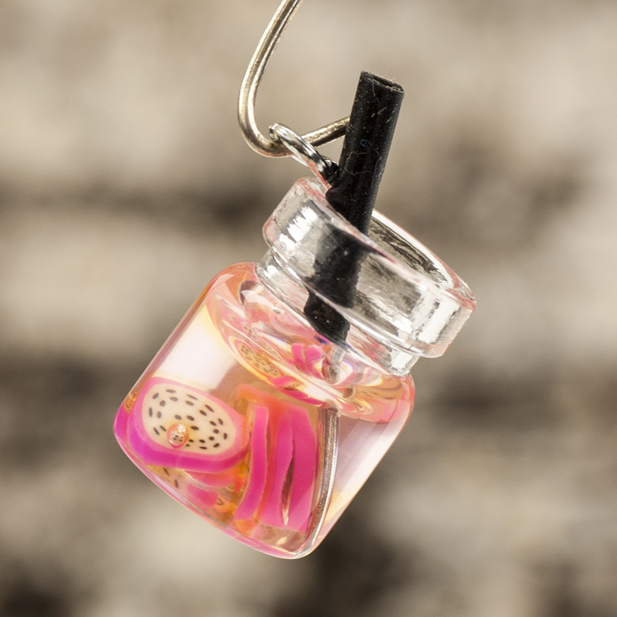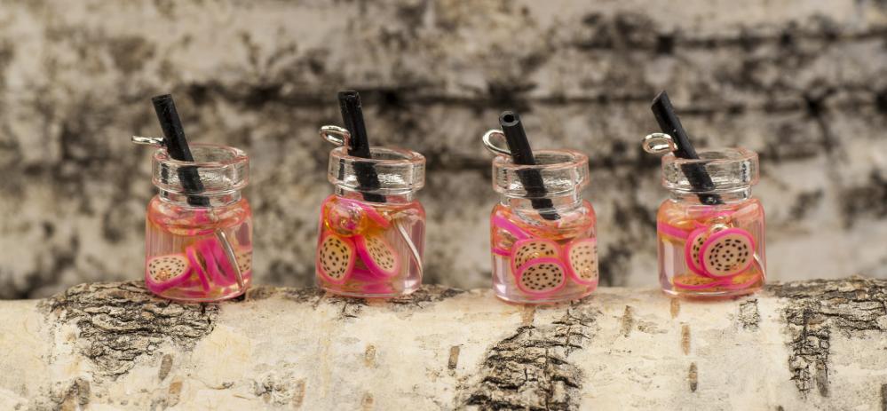 Läskande, speciell berlock att pynta ditt smycke med. Ett litet glas, fyllt med en härlig juice gjord på drakfrukt och äppeljuice, serveras med ett sugrör. Kan finnas färgskillnad på berlocken och bilden lite.