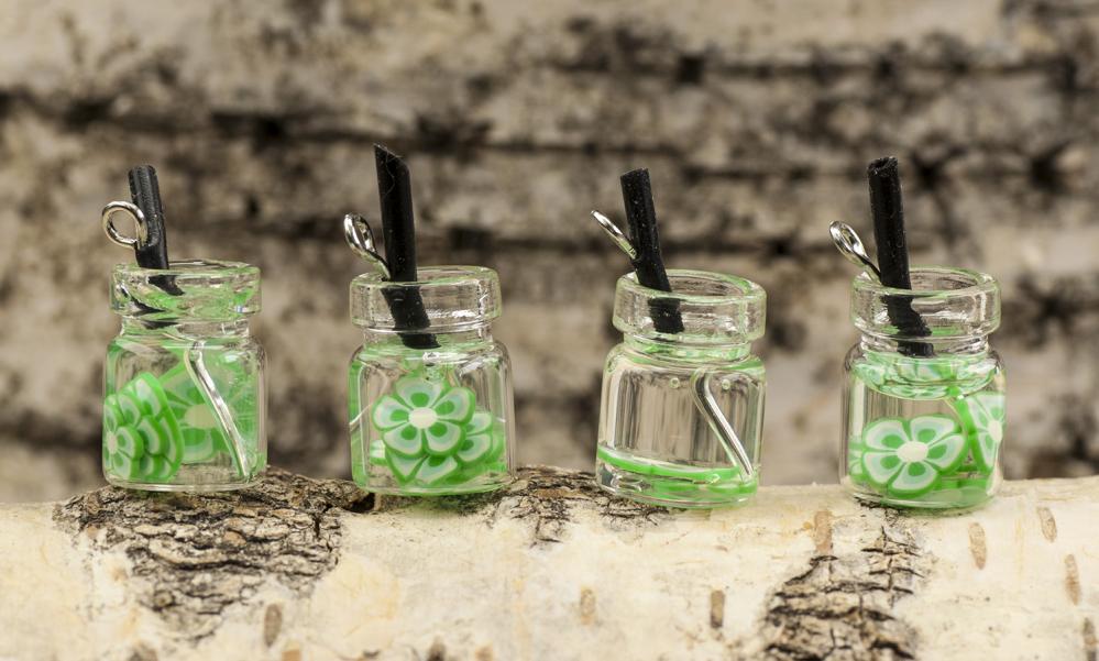 Läskande, speciell berlock att pynta ditt smycke med. Ett litet glas fyllt med en härlig juice gjord på en grön blomma, serveras med ett sugrör.