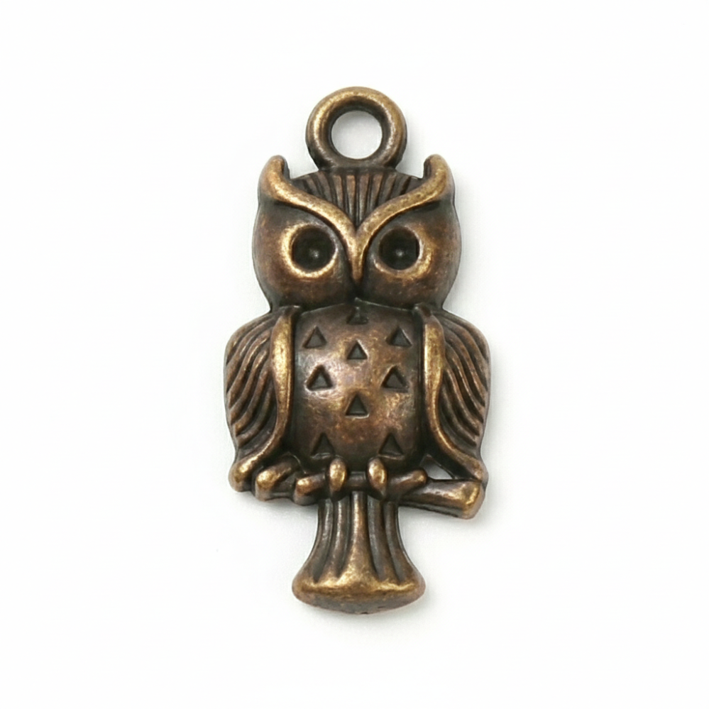 En dekorativ berlock i form av en uggla, perfekt som detalj i kreativa projekt. Den antikbronstonade ytan ger ett klassiskt och tidlöst uttryck som passar både moderna och mer rustika designer.