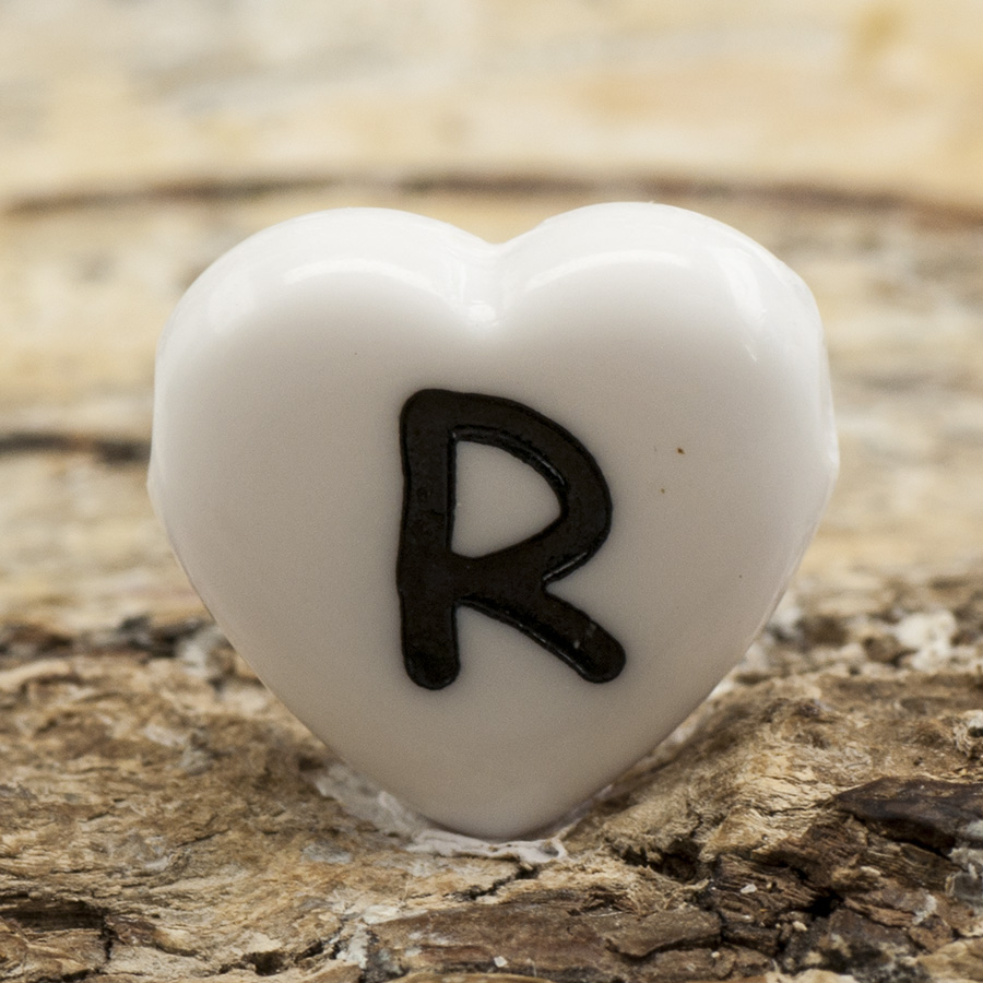 Kul hjärtformad pärla i akryl med bokstaven R på.
