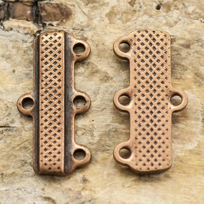 Vacker och praktisk connector i antikkoppar som med fördel används vid avslut. Tre hål på ena sidan och ett hål på den andra.