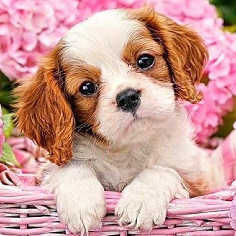 En bedårande valp omgiven av rosa blommor som skapar ett mjukt och charmigt motiv.