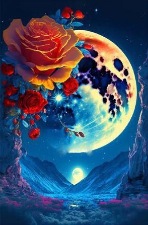 Ett magiskt nattmotiv med måne, rosor och ett fantasifullt landskap som för tankarna till en sagovärld.