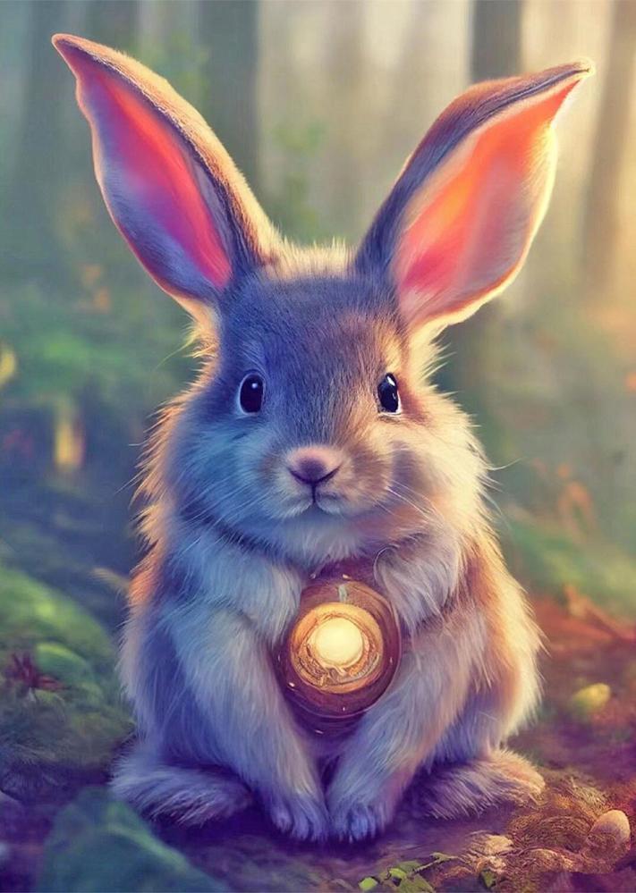 En magisk liten kanin i ett mjukt skogslandskap med ett varmt ljus som skapar en sagolik känsla.