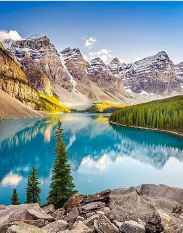 Ett storslaget landskap med berg och spegelblankt vatten som förmedlar naturens lugn och kraft.