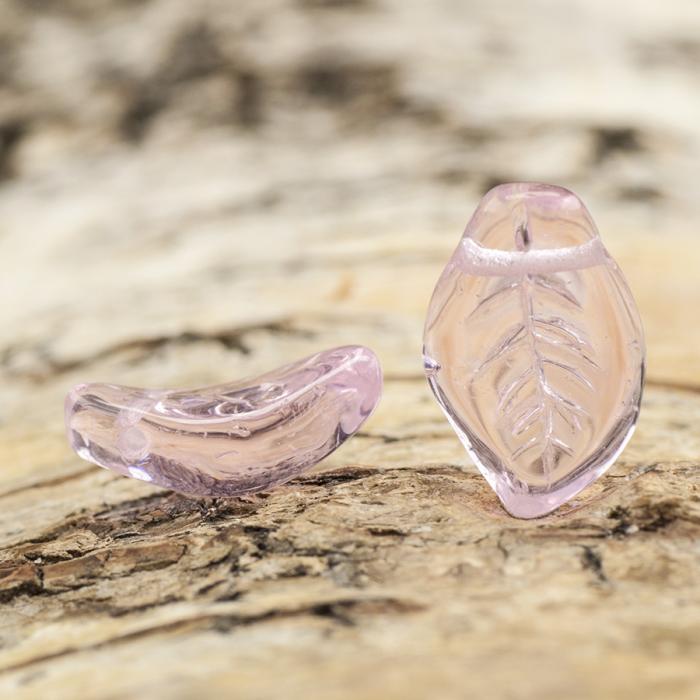 Enkla löv med ådror i transparent, rosa glas. Lövet har en mer böjd form än våra andra löv och kan ge en mer levande känsla, se bild.