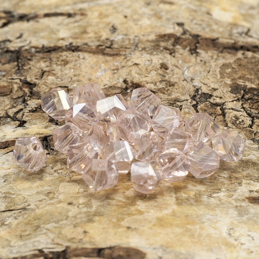 Vacker glaspärla med härlig rosa lyster i en ovanlig twistad form. AB-behandlingen gör att pärlan skimrar i olika färger.