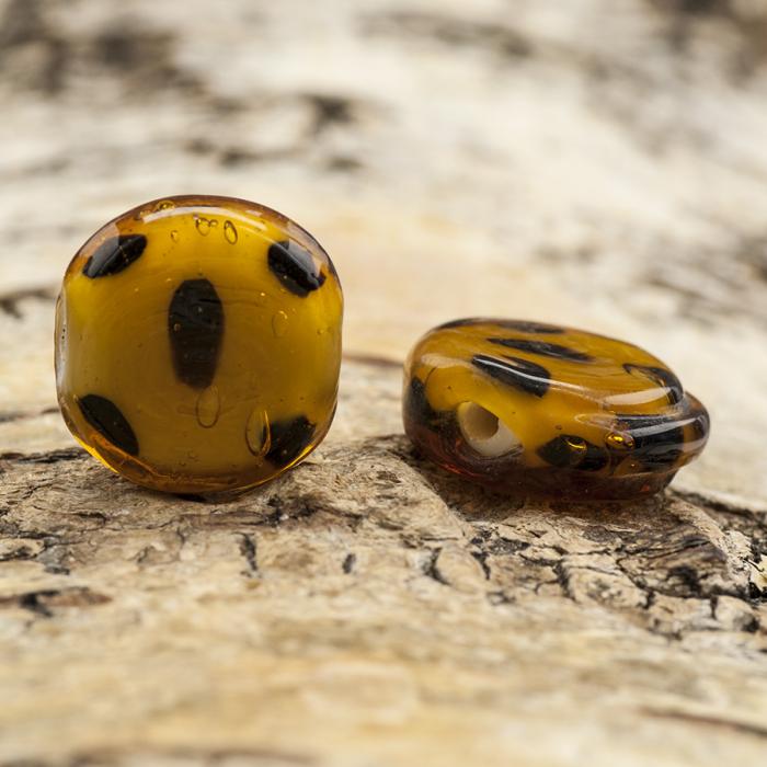 Vacker, handgjord glaspärla i en rund form. En unik pärla med guldfärgad grund och svarta prickar.