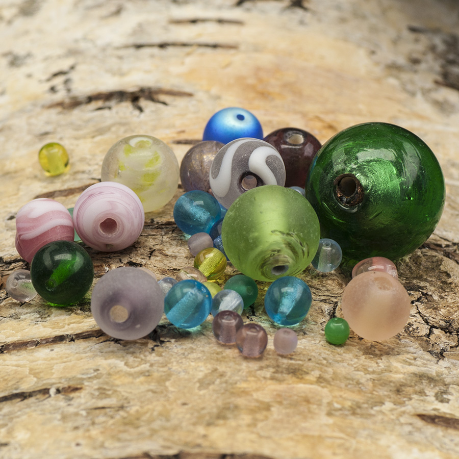 En underbar mix av runda glaspärlor som innehåller många olika storlekar och färger. Med hjälp av dessa pärlor kan du mixa och matcha dina egna kreationer på ett nytt sätt. Innehållet varierar både i ytfinish, storlekar och färger. Bilderna visar exempel på hur innehållet i en påse kan se ut.