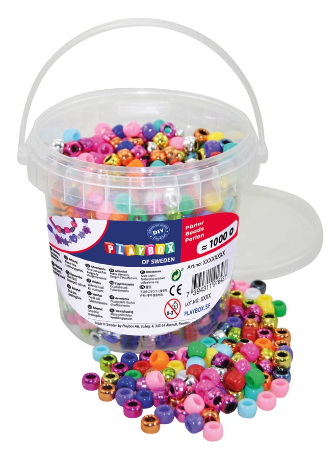Färgsprakande kongopärlor med praktisk hink som förvaring. Den innehåller även elastisk snodd så det är bara att sätta igång att skapa direkt – armband, halsband eller andra dekorationer. En rolig sysselsättning att samlas kring eller varför inte ge bort i present.