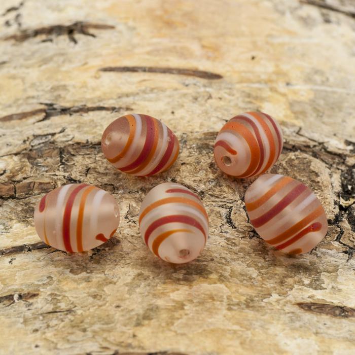 Vacker, frostad glaspärla i oval form. Färgerna som pryder pärlan är i orange, röd och vit vilket ger denne sin unika design.