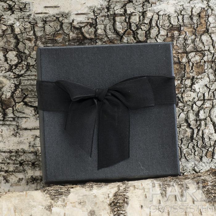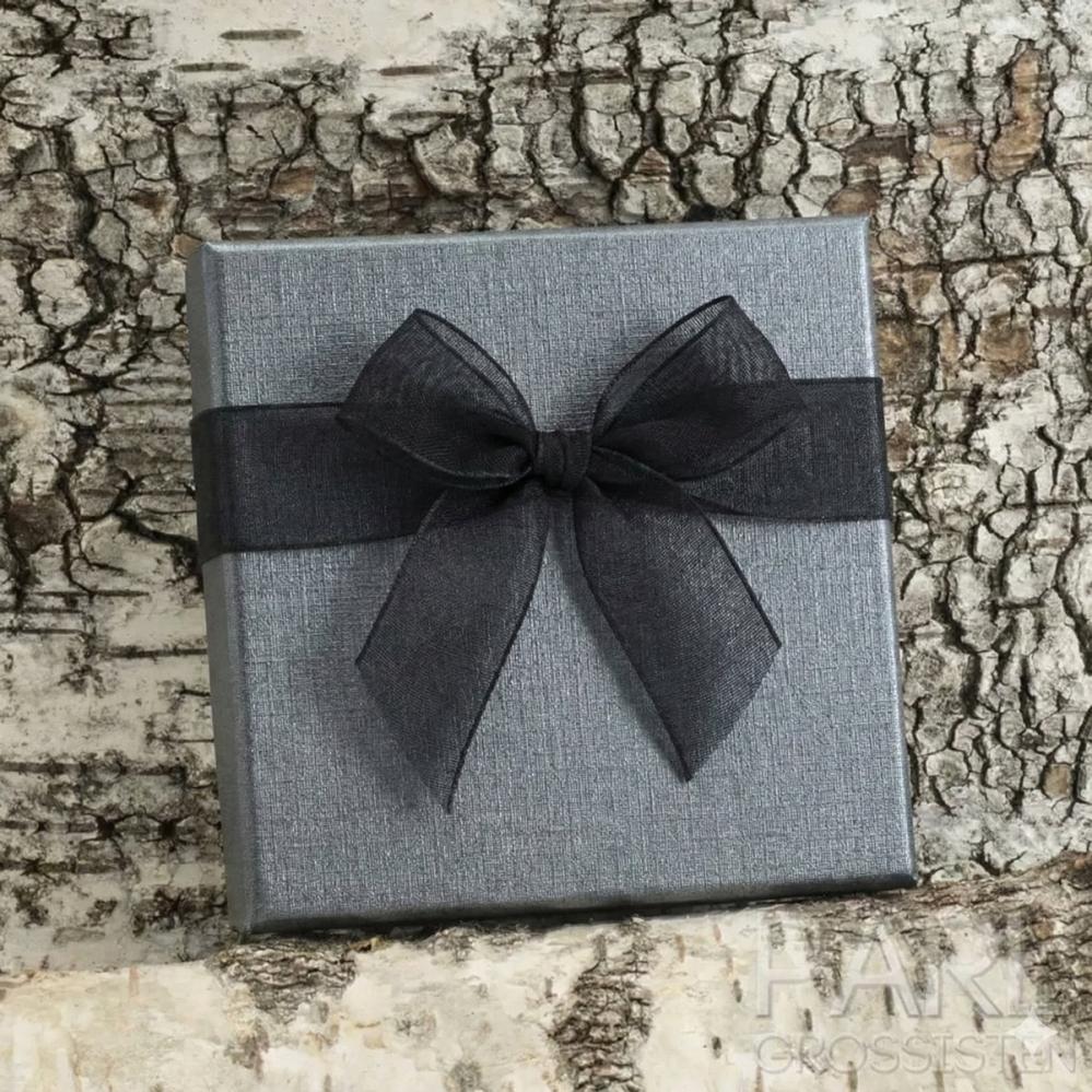 Vacker presentask i svart papp med rosett i svart. Inredd med vitt tyg och stöd för armband.