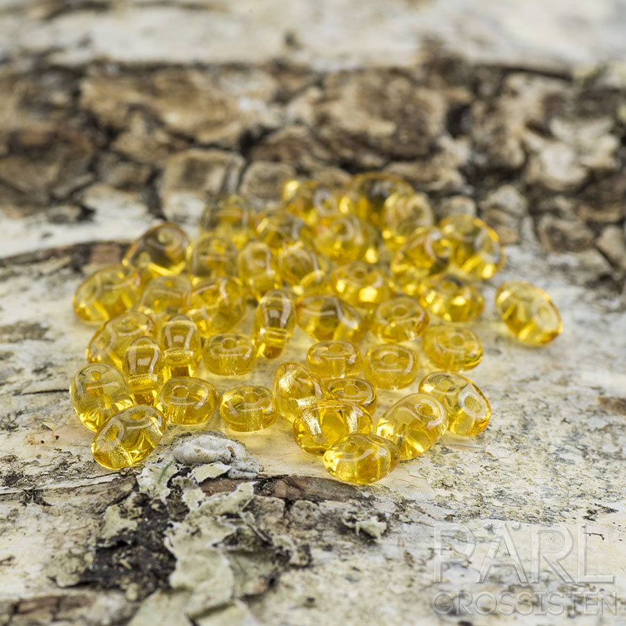 Små ovala pärlor med två hål från Tjeckien. Tillverkade av pressat, genomfärgat glas. 10 gr motsvarar ca 140 pärlor. Hål 0,8 mm.