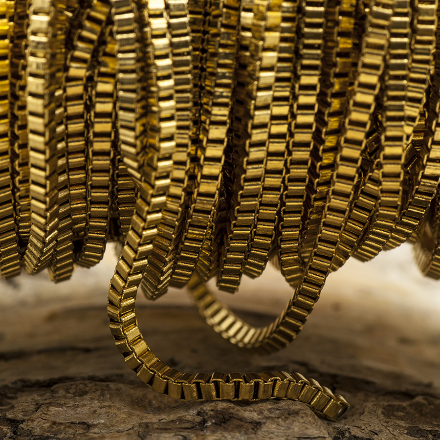 Vacker, guldfärgad kedja av en modell som kallas Venezia. En veneziakedja är en fyrkantig kedja med väldigt kompakta länkar, ungefär som små kuber som är ihoplänkade. På engelska går denna kedja under namnet briolette eller box chain.